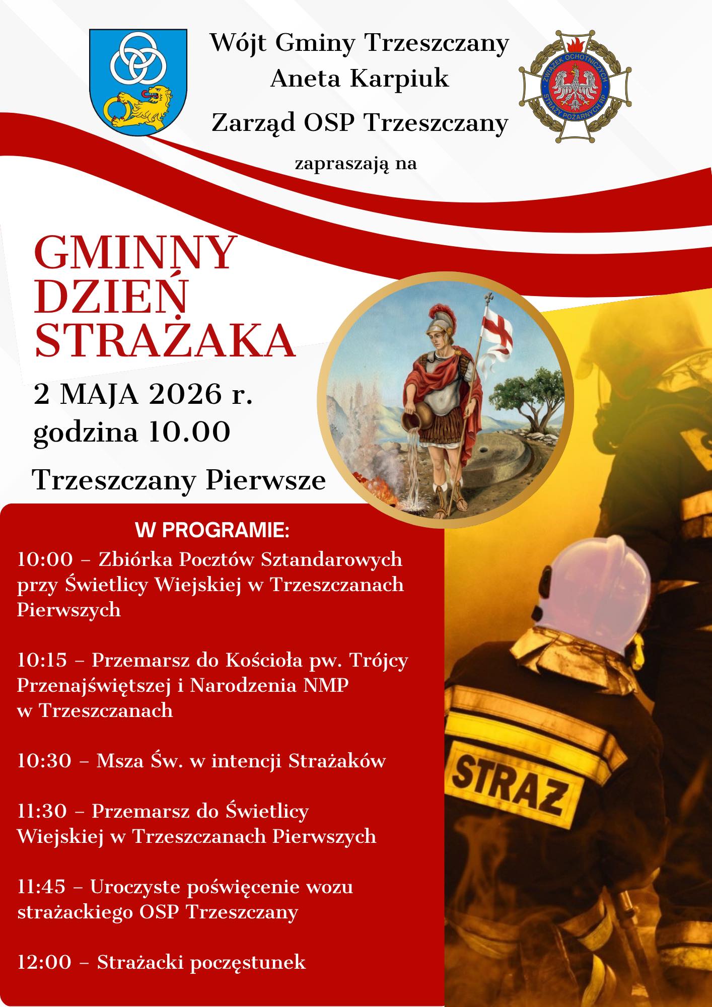 Wójt Gminy Trzeszczany Aneta Karpiuk oraz Zarząd OSP Trzeszczany serdecznie zapraszają mieszkańców na obchody Gminnego Dnia Strażaka. 2 maja 2026 r. Godzina 10:00 Trzeszczany Pierwsze W programie uroczystości: Zbiórka pocztów sztandarowych Uroczysty przemarsz Msza Święta w intencji Strażaków Poświęcenie wozu strażackiego OSP Trzeszczany Strażacki poczęstunek Serdecznie zapraszamy do udziału w uroczystości!