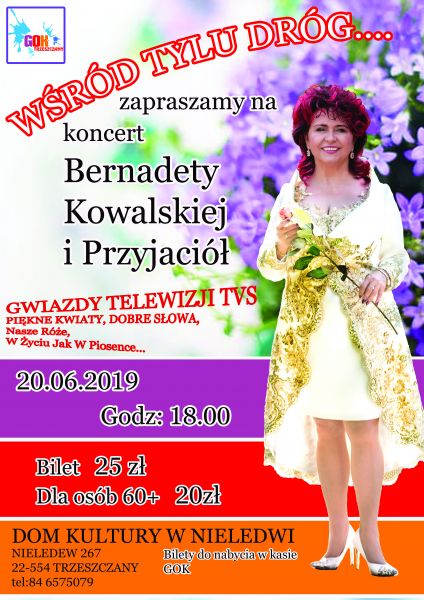 Zaplanowany na dzień 20 czerwca 2019 roku koncert pani Bernadety Kowalskiej odbędzie się w zaplanowanym terminie. W związku z tym nadal istnieje możliwości zakupu biletów, włącznie z dniem koncertu. Bilety będą sprzedawane od godziny 15:00 – 17:00. Serdecznie zapraszamy!