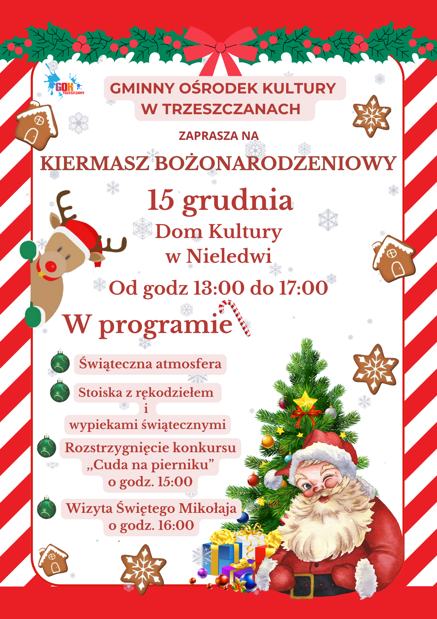 Zapraszamy 15 grudnia na Kiermasz Bożonarodzeniowy! Od godz. 13:00 do godz. 17:00 Dom Kultury w Nieledwi W programie: Świąteczna atmosfera. Stoiska z rękodziełem i wypiekami świątecznymi. Godz. 15:00 Rozstrzygnięcie konkursu ,, Cuda na pierniku”. Godz. 16:00 Wizyta Świętego Mikołaja.