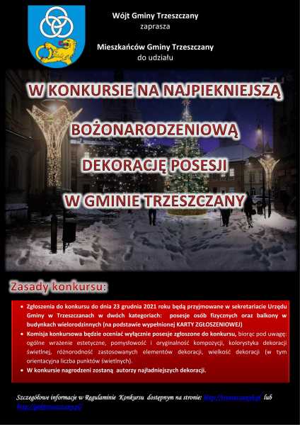 U W A G A – K O N K U R S! 15/12/2021 Autor: admin U W A G A! K O N K U R S! Wójt Gminy Trzeszczany zaprasza Mieszkańców Gminy Trzeszczany do udziału w konkursie „Najpiękniejsza bożonarodzeniowa dekoracja posesji w Gminie Trzeszczany 2021/2022”. Szczegółowe informacje w załączonym regulaminie [Pokaz zdjęć] ZałącznikiRegulamin.tif (164 KB)Karta-zgloszeniowa.tif (35 KB)Regulamin1-1.pdf (165 KB)Karta-zgloszeniowa1.pdf (36 KB)