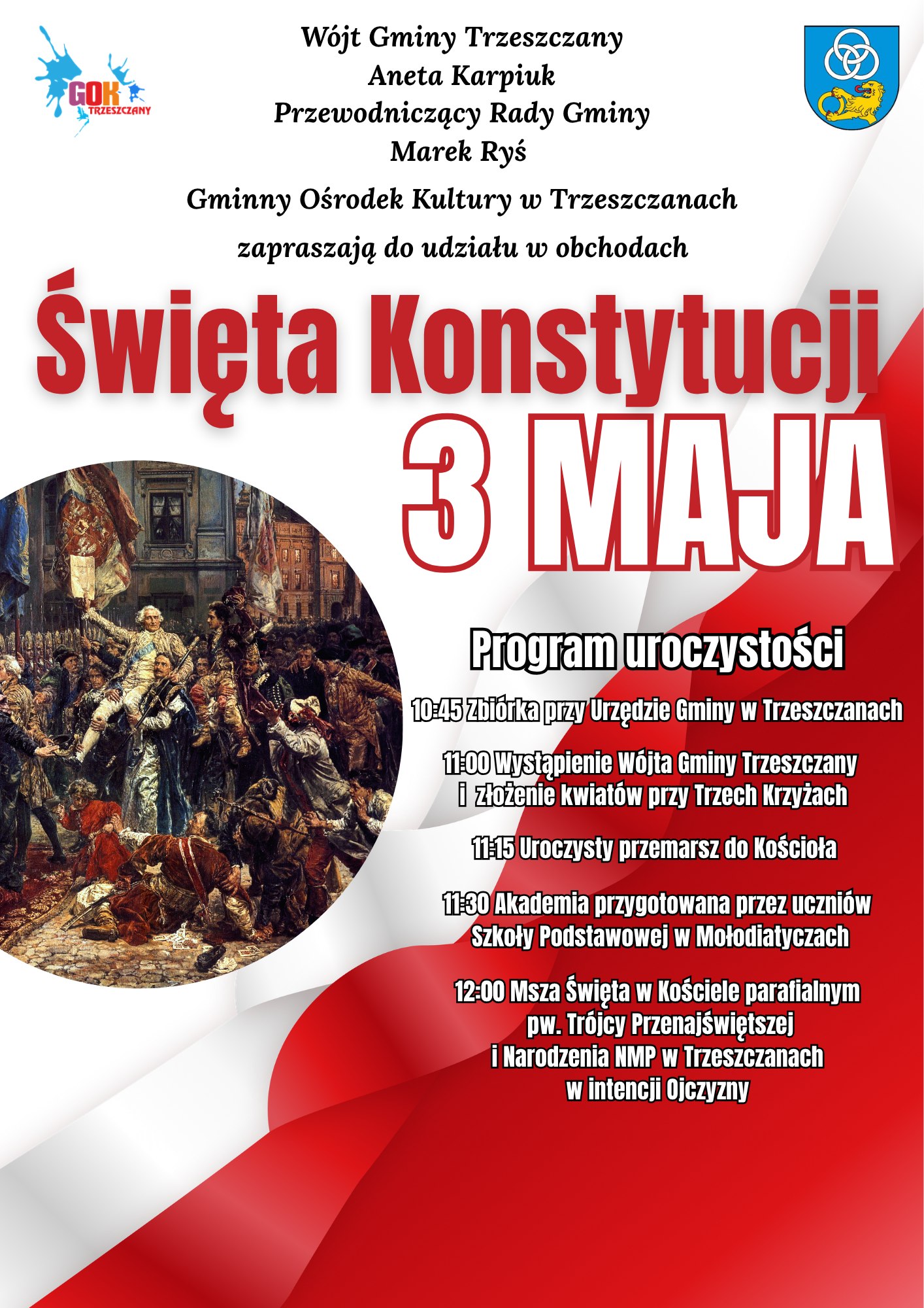 Zapraszamy na Święto Konstytucji 3 Maja 27/04/2026 Autor: admin Zapraszamy mieszkańców Gminy Trzeszczany do wspólnego uczczenia Święta Konstytucji 3 Maja Szczegółowe informację na plakacie.